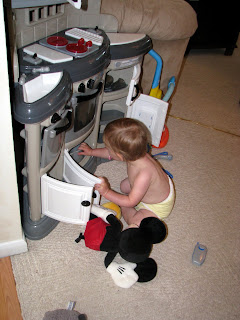 Before they left, Grandma bought Eleanor a play kitchen. Luckily, we opened the box BEFORE they left... because it seriously took 3 adults a couple of hours to put it all together. So, Ellie woke up the morning of her grandparent's departure to a wonderful new toy. It only took her a few moments to realize there was something new in the living room and take full advantage.